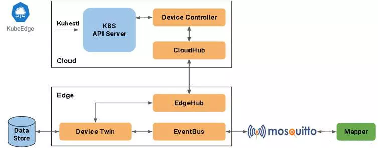 DeviceController: An extended Kubernetes controller that manages device information in the cloud and synchronizes the cloud with edge devices.